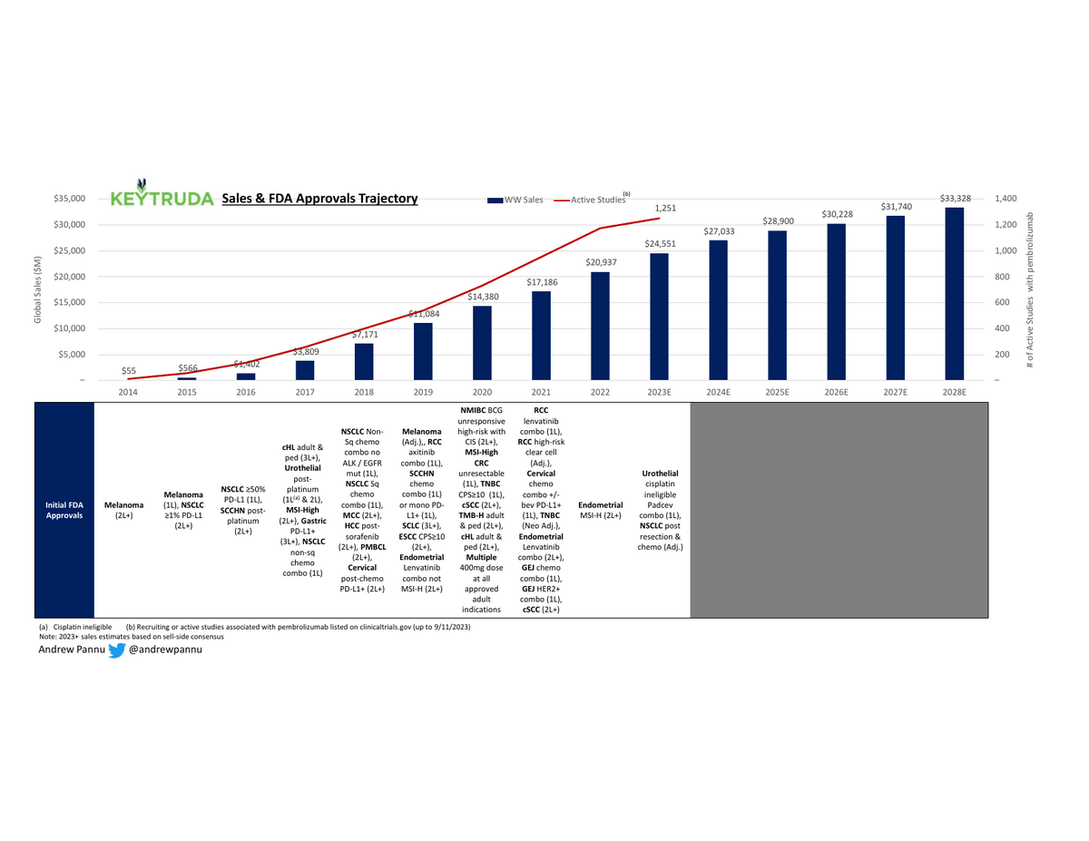Like so many other drugs, the success of Keytruda is full of serendipity. It was discovered accidentally by scientists looking to stimulate (not inhibit) PD-1 and was repeatedly de-prioritized through multiple acquisitions (Organon to Schering in 2007 to Merck in 2009) given how (up to that point) nothing in immuno-oncology worked well. Only after BMS published promising Phase 3 results for Yervoy (a CTLA4 inhibitor) & rumors of great results for an earlier-stage PD-1 inhibitor (Opdivo) leaked did Merck hastily prioritize development
